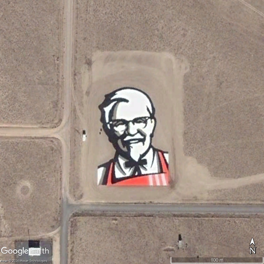 Предыдущие статьи: часть 1.2 1. Самое крупное лицо, которое видное из космоса Это логотип известной сети фастфуда KFC (Kentucky Fried Chicken), известной своей жареной курочкой. На логотипе изображён полковник Сандерс, создатель KFC. Для создания логотипа потребовалось 3000 часов и 65000 разноцветных плиток размером 30 на 30 см. Он находится в пустыне Невада недалеко от Зоны 51. Расположение: США, штат Невада, г. Рейчел (Rachel). Координаты: 37.646,-115.751 2. Домашний аэропорт Джона Траволты Домашний аэропорт Джона Траволты. Давно известно, что американский киноактёр Джон Траволта является очень эксцентричным человеком и заядлым лётчиком. Недавно он обзавёлся домом с личным аэропортом, который является одним из немногих некоммерческих аэропортов в мире со взлётно-посадочной полосой, достаточной для приземления его личного самолёта Боинга 707. На снимках Вы можете видеть вид на весь аэропорт и на дом, с припаркованными около него Боингами. Расположение: США, штат Флорида, г. Окала (Oca