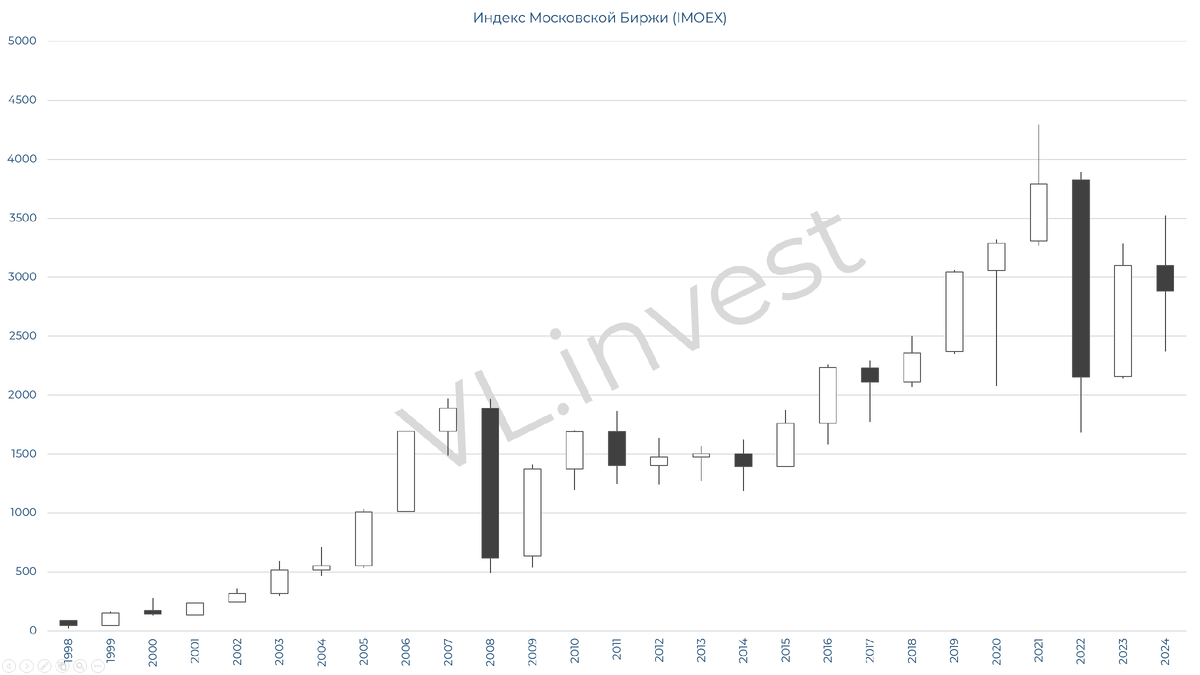 В 2024 году индекс торговался разнонаправленно. Первые 4 месяца рос, затем 4 месяца снижался, после падение остановилось и даже был отскок в сентябре, но затем опять падающая свеча в октябре, неопределенность в ноябре и новогоднее ралли почти в 20% под конец декабря.