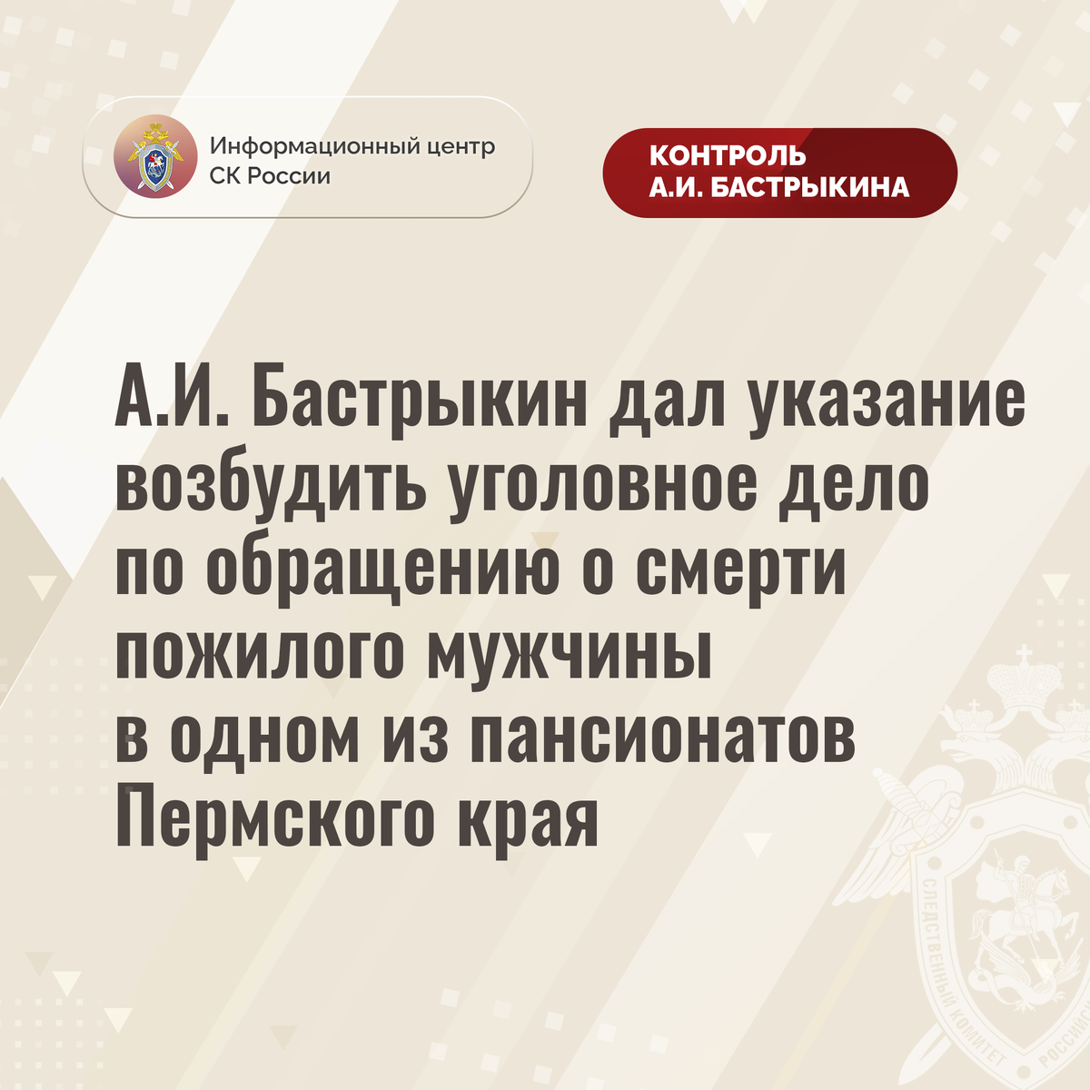 А.И. Бастрыкин дал указание возбудить уголовное дело по обращению о смерти пожилого мужчины в одном из пансионатов Пермского края