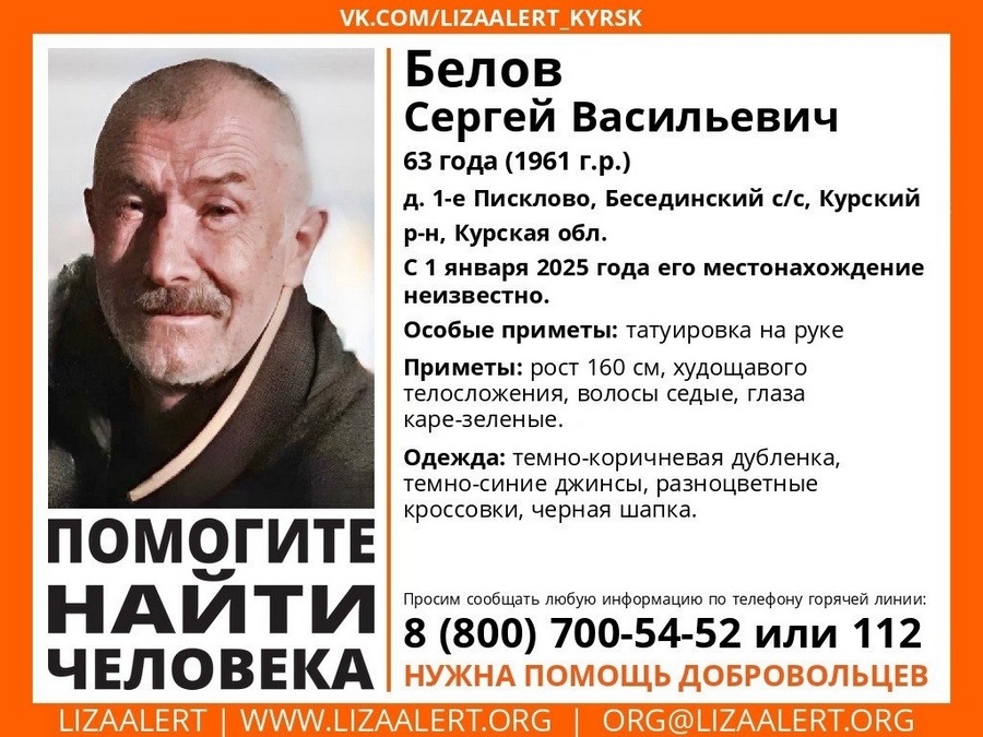 Волонтеры поискового отряда «Лиза Алерт» объявили срочный сбор в пригородном Курском районе. В деревне 1-Писклово пропал 63-летний мужчина. Вот уже несколько дней родственники ничего о нем не знают. Сообщается, что Сергей Белов вышел из дома 1 января. С тех пор его местонахождение неизвестно. Приметы пропавшего: рост 160 сантиметров, худощавого телосложения, волосы седые, глаза каре-зеленые. Мужчина был одет в темно-коричневую дубленке, темно-синие джинсы, разноцветные кроссовки и черную шапку. В качестве особой приметы выделили татуировку на руке. Информацию о пропавшем мужчине можно сообщить по бесплатному единому номеру «Лиза Алерт» 8(800)700-54-52 или по телефону 112. Антон ФИЛИППОВ, фото Лиза Алерт Курская область Постоянный адрес новости на сайте «Друг для друга» ~ https://dddkursk.ru/lenta/2025/01/06/115052/. Новости Курска за ~ 6 января ~ январь 2025 года.