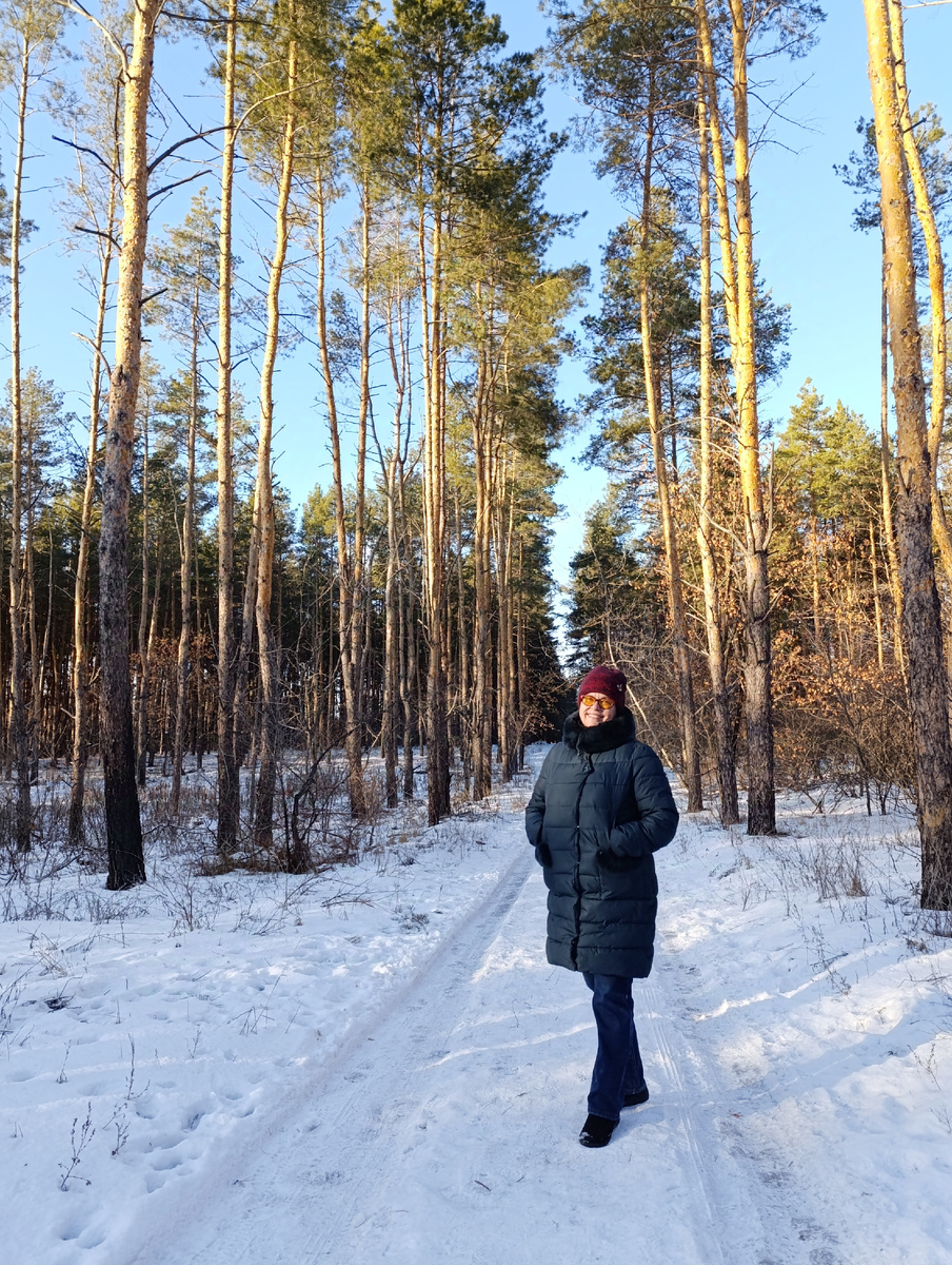 Белым-бела, таинственна дорога, Ведущая из осени в весну. Взгляни на эту одинокую сосну - Она лишь веха на пути, которых много. И неба купол ярко - синий , И снег...и солнце...и мороз! Как величаво и просторно, Почти торжественно в лесу! Как будто вмиг сама природа, Наводит пышную красу. Обворожительное царство. Зима прекрасна в чистоте. О,небывалое убранство, О,тяга к вечной простоте! Ах, этот зимний, милый сердцу лес! Благодарю тебя за крохотное счастье С тобою быть, встречаться и прощаться, В себя вбирая капельки чудес! Вот таким был день перед Рождеством - чуть морозным и солнечным!