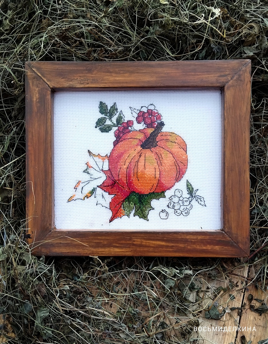 Итак, 2024 год начался с оформления тыквы. Я красила деревянную раму, делала подложку, закрепляла вышивку. Думала, что эта картина будет украшать дом только в сезон с августа по ноябрь, но так уютно она выглядит, что стои́т теперь всё время на виду.