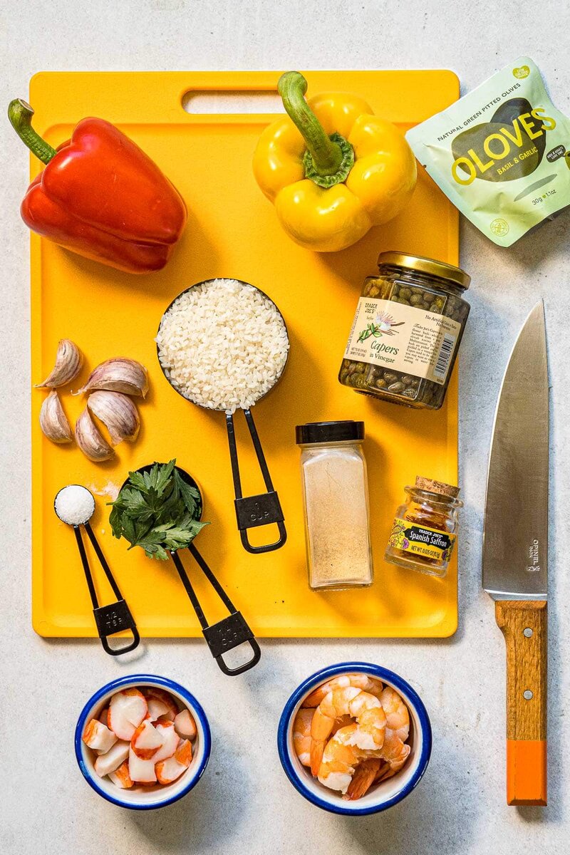 Полностью приготовленные креветки и «имитация краба» придают этой паэлье морепродуктовый оттенок. Их легко найти в местном магазине, они просты в подготовке и хорошо восстанавливаются. В этом рецепте также присутствует разнообразие соленых средиземноморских вкусов, вроде каперсов и оливок. А объединяет все это яркое золотистое шафрановое рисовое основание.