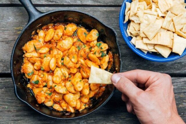 Мы адаптировали этот дип из масла по рецепту, который нашли на Serious Eats, который, в свою очередь, был адаптирован на основе нескольких различных источников испанских тапас. Хотя некоторые соотношения изменились, основные элементы остались прежними: крупная и кремовая белая фасоль, томатная паста, чеснок, шалот, оливковое масло и паприка, тушенные вместе и подаваемые горячими.