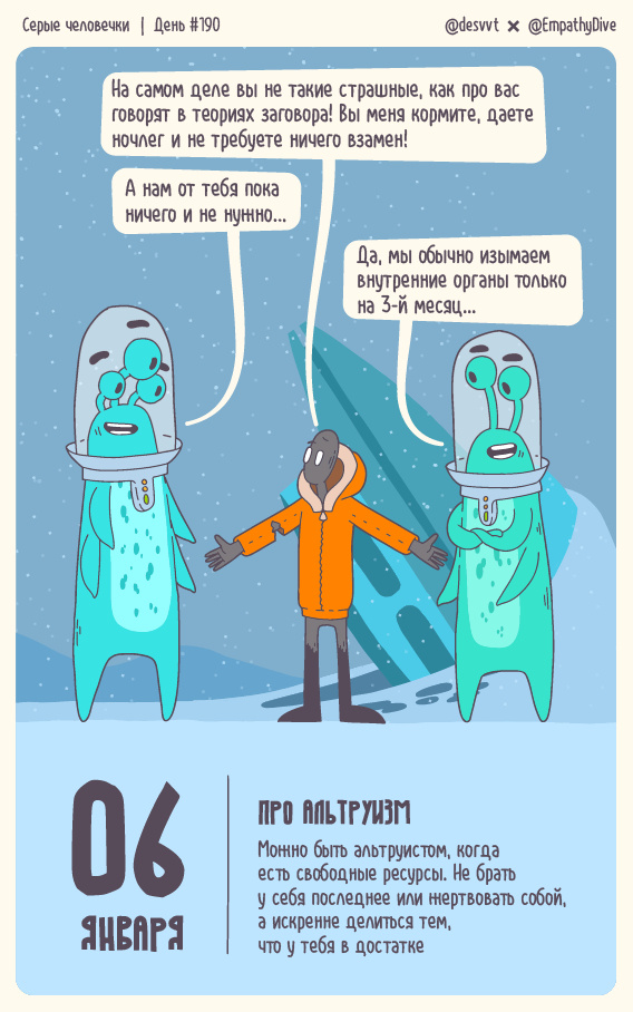 Проект Серые Человечки — совместный ежедневный проект-календарь иллюстратора @desvvt и психолога @empathydive длиной в год, в формате полувредные советы. Текст на комиксе является полезным советом по бытовой психологии, а персонажи в комиксе доводят все до абсурда, устраивают сатиру, перегибают со стереотипами, то есть всячески показывают КАК ДЕЛАТЬ НЕЛЬЗЯ. Все посты можно посмотреть в серии постов.