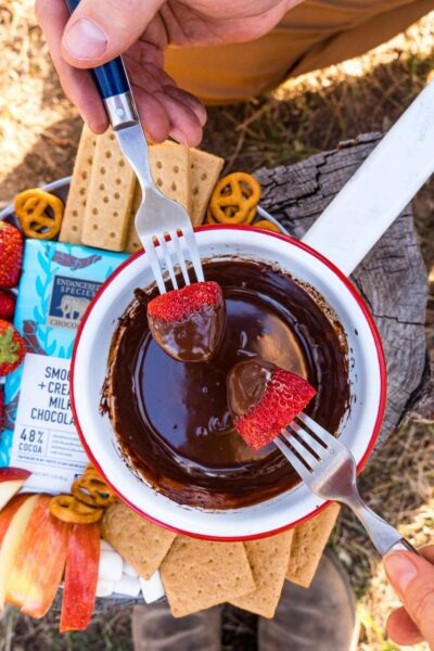Сочетая шелковистый шоколад с разнообразными вкусными закусками, это шоколадное фондю — один из самых декадентских (и простых!) десертов для кемпинга, которые мы когда-либо готовили!