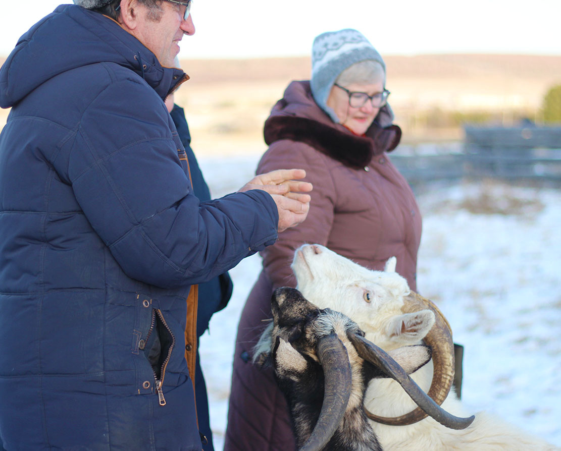 Козы мои немного побывали в роли туристического объекта. Для небольшой экскурсионной группы, что проехала в Рождественские праздники по району. Да с ветерком, да с песнями! Заехали и в нашу деревню. Как раз, унялся ветер, получилось, наконец, выпустить рогатое стадо на улицу. На часик. Когда приехали гости, я позвала стадо, козы выбежали из кустов и обступили людей. Не все. Старшие козы тотчас принялись выпрашивать вкусняшки, молодые ускакали в поле, стоять поодаль и трусливо пускать слюнки. Пользуясь случаем я перецеловала все козьи морды, как же их люблю! Отсыпала гостям горсти овса, чтобы люди добрые могли насладиться процессом. Процессом нежного вдувания зерна с ладоней))) Козы всегда беспроигрышный вариант. Милы, умны и прожорливы! А потом козы обступили машины, продемонстрировав козью автомойку. Облизали машины до блеска. Соль, реагенты, все как мы любим. Затем делегация прошла в козлятник, где гостей ждал козлик Митя и маленькая козочка. Да, предновогодний внеплановый козленок о