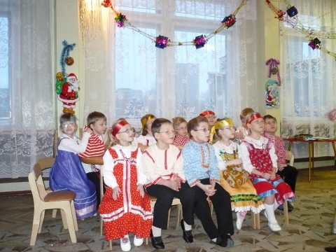Детишки и воспитатели радостно встретили нас и проводили в небольшой актовый зал.