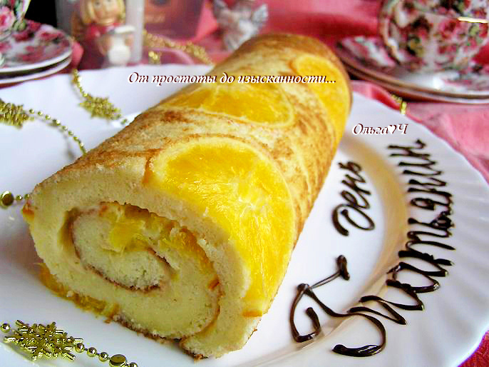 Всем доброго дня! Этот рулет я однажды готовила ко дню святой мученицы Татьяны Римской, в народе называемом Татьяниным днем или Днем студента. Поздравляю всех причастных с праздником! Рулет настолько красив, что не нуждается в дополнительном украшении, а сам себя украшает! Как вы уже догадались, главный ингредиент - апельсин, который служит декором и одновременно является начинкой! В довершении ко всей этой красоте, вкусноте и потрясающему аромату я добавила грейпфрутовый заварной крем. Угощайтесь! P.S.: Вы не поверите, но это был мой самый первый рулет, который я приготовила! Ингредиенты: Крем: