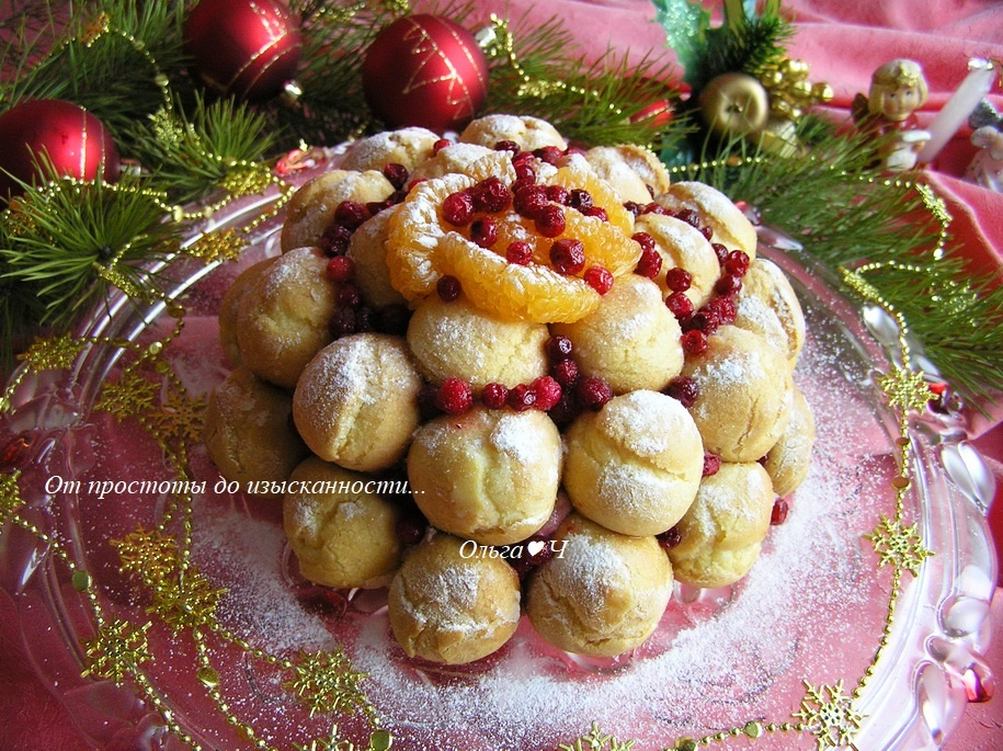А этот шикарный торт я готовила однажды как раз на старый Новый год. В составе: профитроли с лаймовым заварным кремом, крем Сабайон из розового вермута и начинка из брусничного желе. Вкусно очень, рекомендую!