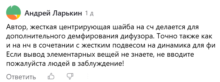 "Поскольку нч динамик создает высокое звуковое давление, которое несмотря на маленький обьем камеры сч, все-таки создает ненужные колебания сч дифузора." - чего?))) Разберем ту часть, которую Андрею все-таки удалось сформулировать: ненужные колебания СЧ диффузора. Для гашения колебаний диффузора нужен не жесткий подвес, а вязкий. Резиновый такой, толстый, мягкий, на СЧ динамик - ммм, как гасить колебания будет. Но обычно такие вот деятели такого не любят, калошами называют, говорят что звук будет резиновым и не ярким. А как же так, неужели нравится колебания диффузора слушать?))