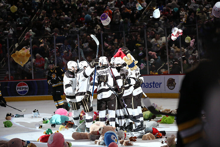 И так каждый сезон. Фарм-клуб «Вашингтона» – «Херши» – обычно возникает в российских новостных лентах два раза раз в год: летом, в связи с новым чемпионством в АХЛ, и зимой – по поводу очередного рекордного нашествия игрушек на льду. Сейчас январь – и все понимают, что будет дальше по тексту. Прошлой ночью состоялся домашний матч «Херши» с акцией Teddy Bear Toss – болельщики запаслись мягкими игрушками в ожидании гола своей команды. Долго ждать не пришлось – на 15-й минуте первого периода Майкл Сгарбосса сравнял счет. Так голы 32-летнего нападающего еще не праздновали! Только на то, чтоб все игрушки долетели до льда, ушло больше 5 минут. Было понятно, что продолжать первый период нет никакого смысла – оставшиеся 5:17 доигрывали уже во втором. Но перерыв между ними все равно сильно затянулся – волонтеры собирали игрушки со льда около 42 минут. Интересно, что первый раз за вечер их начали бросать еще до гола Сгарбоссы – с одного из секторов показалось, что защитник «Херши» Чейз Приски за