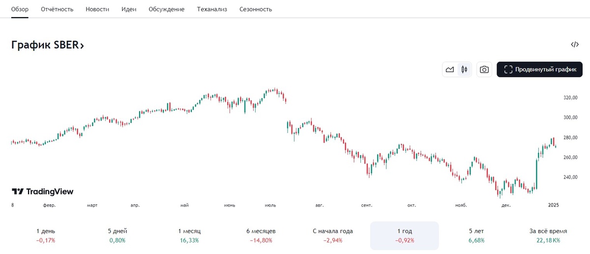 За последний год акции Сбера практически не изменились в цене и в начале 2025 года находятся примерно на том же уровне, что и в начале 2024 - сейчас около 270 рублей за бумагу.