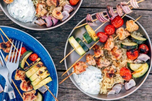 Мы обожаем эти шашлыки из курицы с соусом цацики в греческом стиле. Чтобы подготовить это блюдо для кемпинга заранее, нарежьте овощи и курицу, а также сделайте (или купите) соус цацики дома. Тогда на месте кемпинга вам останется только собрать и запечь шашлыки на гриле.