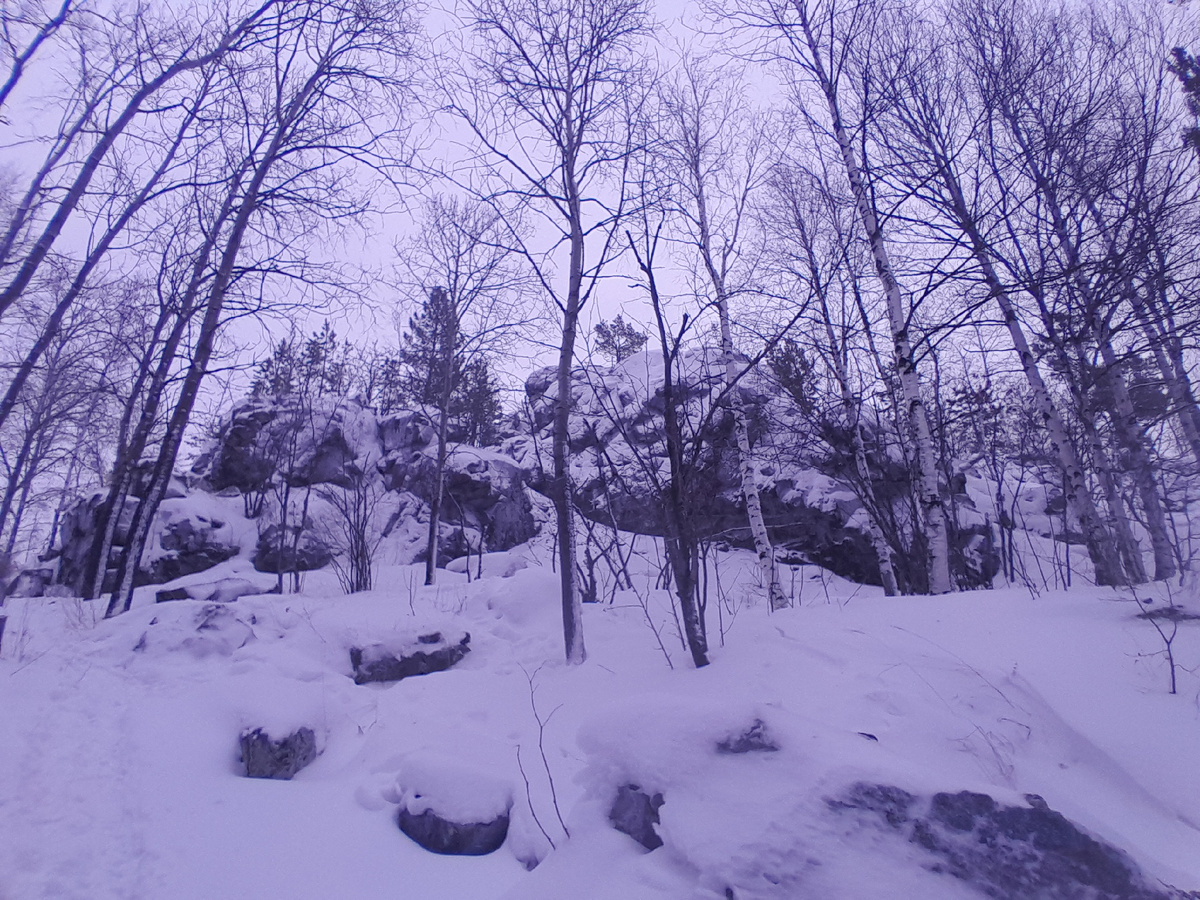 Начали обходить гряду справа, против часовой. Нашли смотровую, но мелкий снежок усилился и обзором нам насладиться не удалось. На 2й смотровой установлен стенд, где рассказано о находке школьников в походе в 1939 году древностей в этом месте. Вот ведь, в походы какие то ходили, нет чтоб в телефонах зависать, правда?