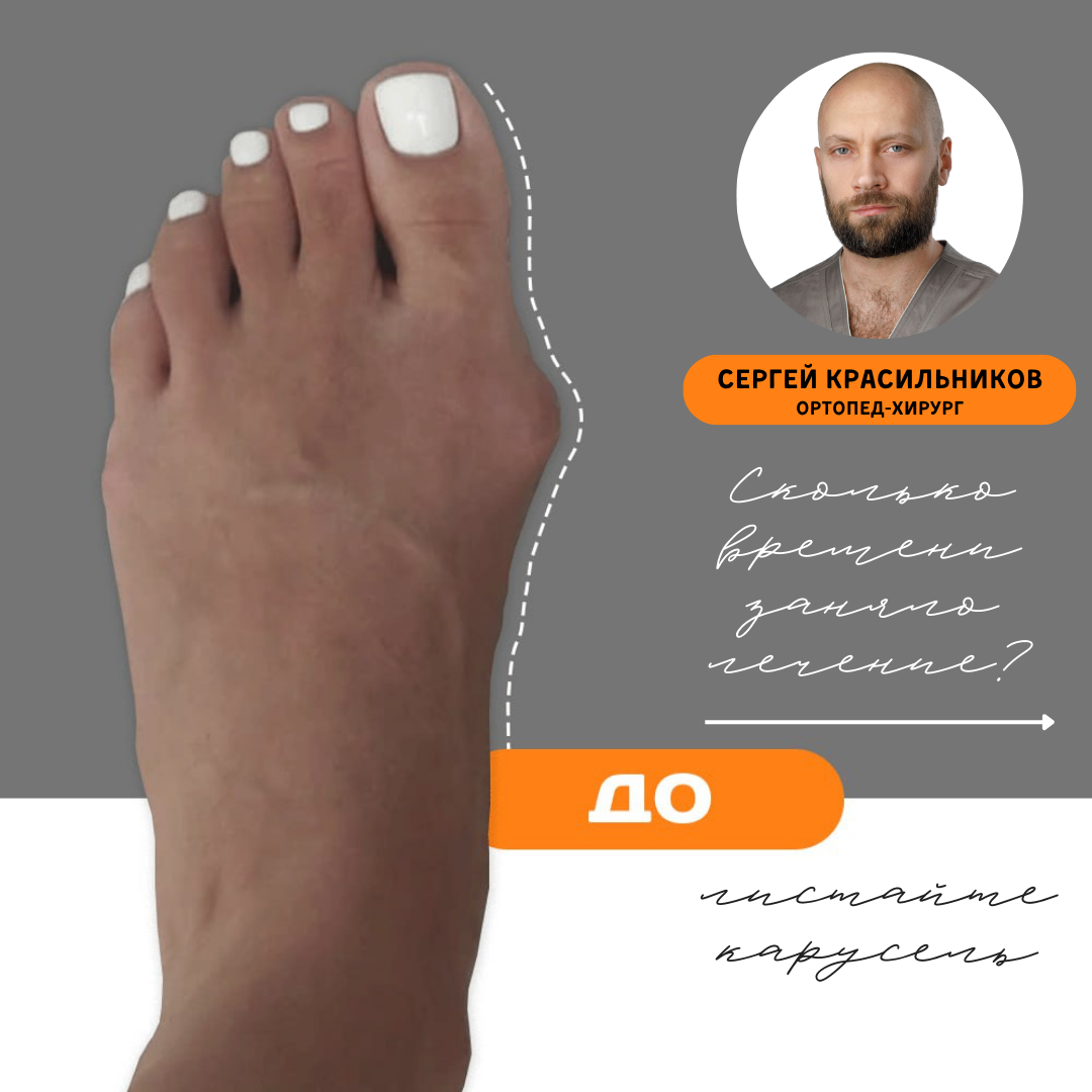 Пациентка 33 лет обратилась в июле 2024 с жалобами на боль при ходьбе в области первого плюснефалангового сустава, трудности в подборе обуви. На осмотре объем движений в суставе в полном объеме, а на рентгенограммах - вывих первого пальца стопы. Выставлен настоящий диагноз: Вальгусная деформация первого плюсне-фалангового сустава. Из истории болезни выяснилось, что попытки лечения стельками и межпальцевыми распорками оказались безуспешными. Для оперативного лечения была выбрана чрескожная коррекция вальгусной деформации, которая была проведена 27 августа 2024г. 👉Операция проводится через проколы, что обеспечивает вам быструю реабилитацию и не оставляет больших шрамов. 👉Операционное вмешательство сопровождается рентгенологическим контролем, что позволяет хирургу работать с ювелирной точностью. 👉Используется проводниковая анестезия (обезболивается только оперируемая стопа) и медикаментозный сон (седация). 👉Длительность самой операции составляет всего 20 минут. 👉Гипс и металлоконстр