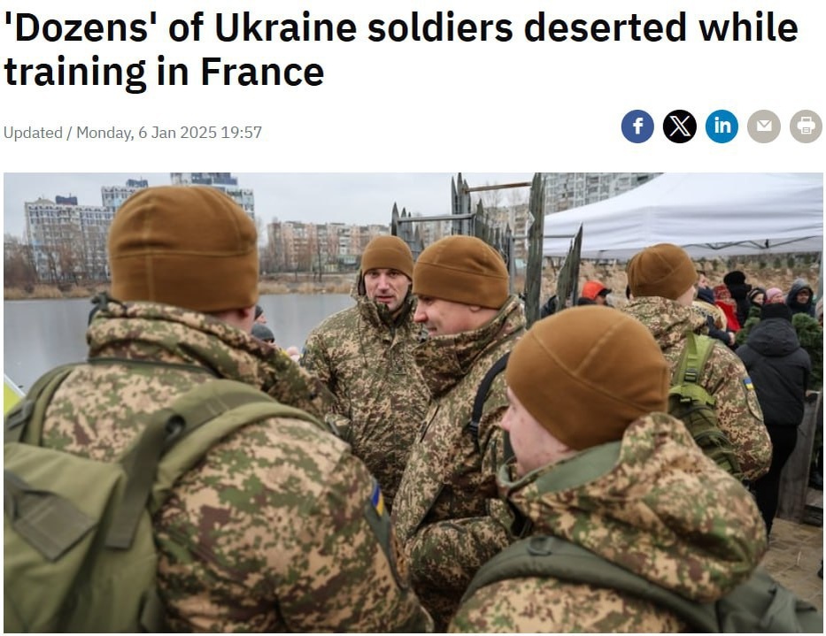 ▪️«Было определенное количество случаев дезертирства. Они находились во французских казармах и имели право выходить», – сказал чиновник телеканалу RTE. ▪️Украинские военные, проходившие подготовку во Франции, подпадали под дисциплинарный режим, «установленный украинским командованием». «Во Франции дезертирство не является уголовно наказуемым деянием. Если кто-то дезертировал, французский прокурор не имел полномочий арестовывать этого человека», – заявил чиновник. ▪️Ранее о дезертирстве 50 украинских военных из бригады «Анна Киевская» во Франции сообщил журналист Юрий Бутусов. Также уже по возвращению бригады в Украину из нее в СЗЧ ушли 1700 человек. t.me/RVvoenkor