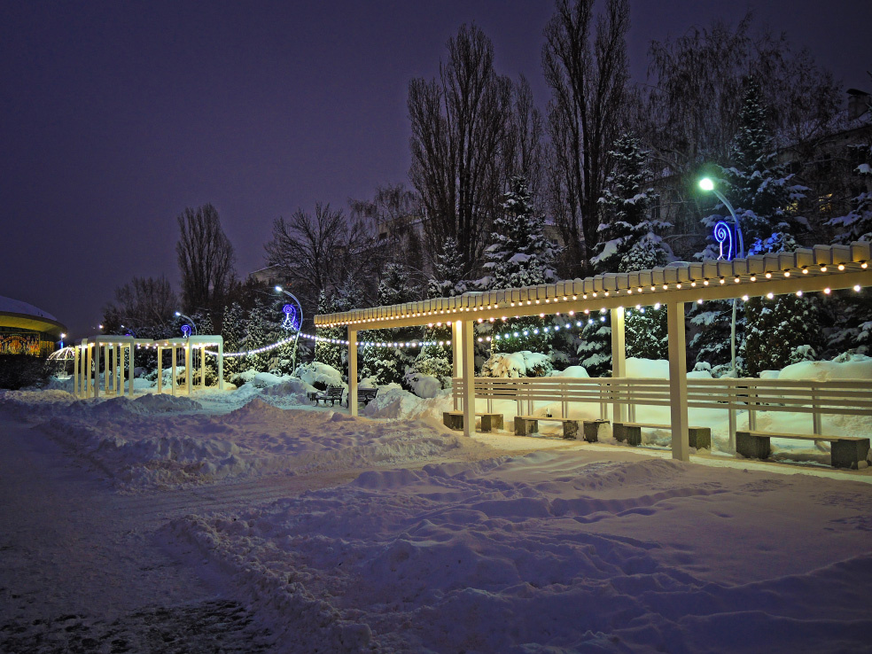 Заканчивается аллея площадкой с беседкой. Раньше она имела полную подсветку. Теперь осталось кое-что. На заднем плане видно здание цирка.