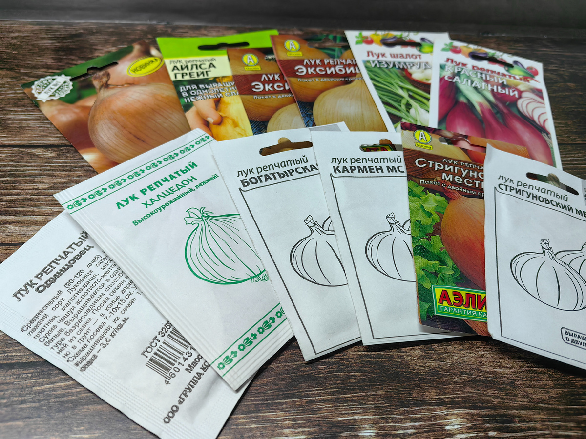 Друзья, если вы давно меня читаете, то знаете, что я фанат выращивания лука из семян. Я совсем не сажаю и не покупаю севок и предпочитаю выращивать лук в однолетней культуре через рассаду. При чем выращиваю как привычные крупноплодные сорта типа Эксибишен, так и стандартный лук-репку. Вот как раз сижу корректирую набор сортов на новый сезон и обнаружила, что не делала обзор на выращенные сортов стандартного размера. Вот такой набор семян у меня пока что имеется.