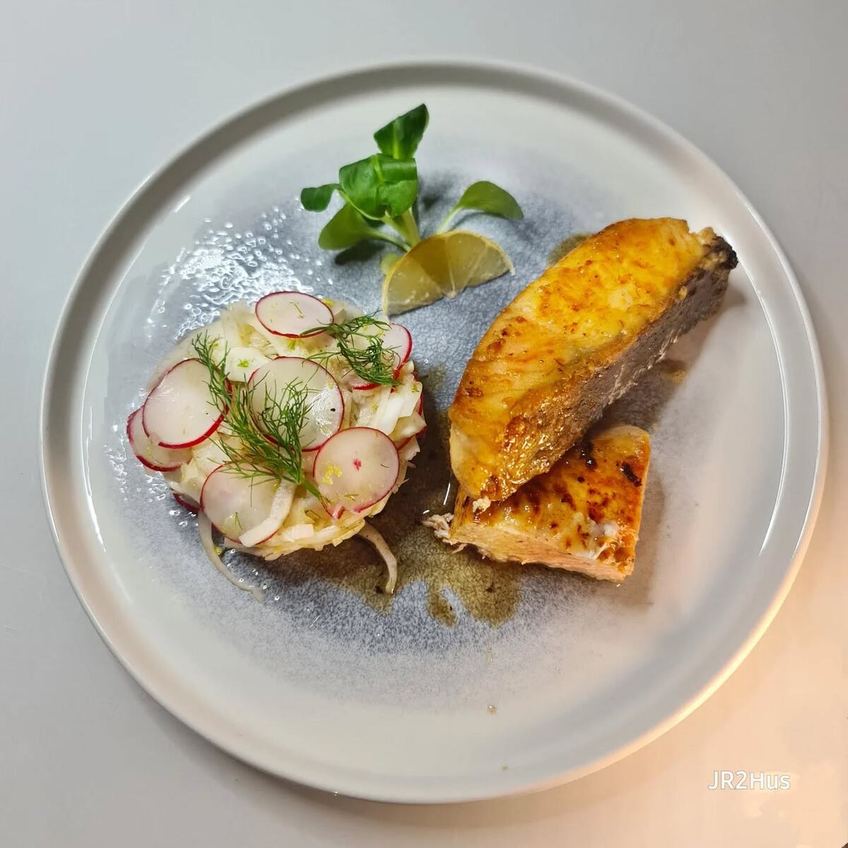 Обжарьте его на сливочном или оливковом масле и подайте с салатом из фенхеля и редиса, заправленным бальзамическим или оливковым маслом. Приготовление стейков из лосося: Очистите рыбу, удалив чешую и косточки. Подкислите, сбрызнув лимоном или лаймом. Посолите, используя измельченную морскую соль. Разогрейте сковороду с оливковым маслом. Обваляйте стейки в муке, удалите излишки и обжарьте их кожицей вверх до появления легкой корочки. Повторите то же самое с другой стороной, но кратко. В завершение положите на кожу кусочек сливочного масла, добавьте немного лимонного сока и доведите до готовности. Приготовление салата из фенхеля и редиса: Смешайте мелко нарезанную зелень фенхеля с нарезанным луком-шалотом, добавьте немного белого бальзамического уксуса, оливкового масла, щепотку сахара, а также соль и перец по вкусу. Затем добавьте мелко нарезанный фенхель и редис, тщательно перемешайте. Приготовлено на: Amt Gastroguss
