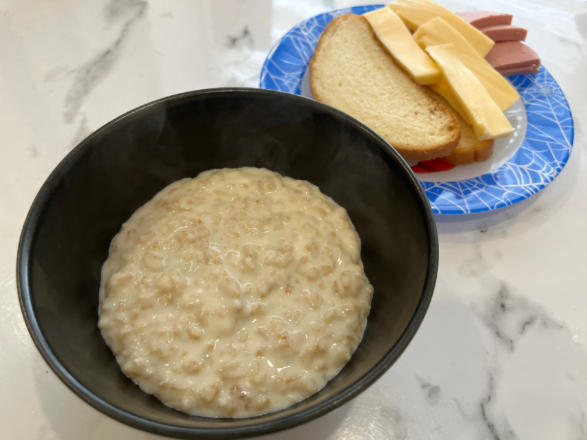 На завтрак была кашка овсяная молочная. Бутерброды с сыром и колбаской.