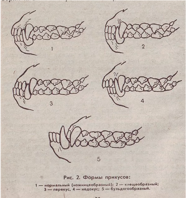 Ветеринары и кинологи называют несколько видов взаимного расположения верхних и нижних резцов: ножницеобразный прикус; прямой прикус; перекус или прогения; недокус.