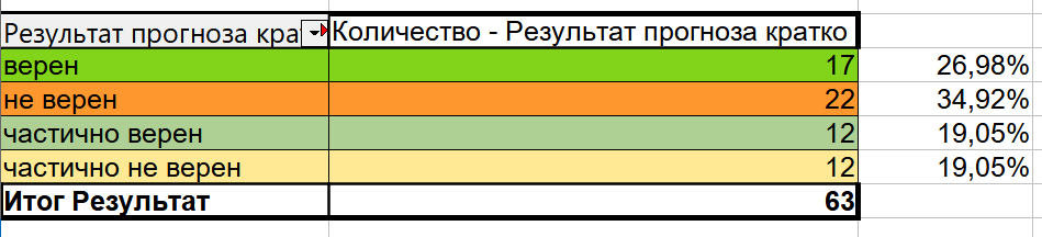 Подведем итоговый анализ точности прогнозов аналитиков за 2023 год, которые я публиковал в прошлом году на помесячной основе: Общий процент неверных прогнозов 34.92+19,05=53,94% чуть выше, чем процент верных: 46.03%. Но это намного лучше, чем были прогнозы 2022 года: То ли аналитики в 2023 году стали лучше работать, то ли Блумберг стал лучше выбирать прогнозы для публикаций. Удачи и трезвого анализа в ваших инвестициях!!! P.S. Подписывайтесь на мой телеграмм-канал: https://t.me/Cervonets