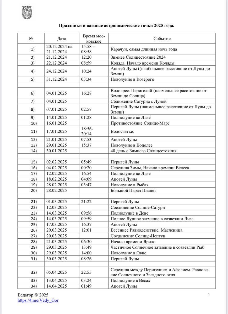 Друзья, здравия Продолжаю начатую в прошлом году традицию - календарь важных дат в традиции Родных Богов. Я свел в одну таблицу все важные звездные и небесные явления 2025 года, на которые лично я обращаю внимание для определения дат того или иного праздника. Также в таблице указаны праздники, которые отмечаю лично я и в которые обычно провожу обряды для всех желающих. Если какой-либо праздник не указан, это значит, что лично я, на текущий момент, его не отмечаю и в 25 году отмечать не буду. Без претензий на какую-либо истину, еще раз хочу подчеркнуть - в прилагаемой таблице изложена моя личная точка зрения на праздники, связанные с родной традицией и Родными Богами. Вы вольны пользоваться ей, вольны пройти мимо. Пусть всё обернется на благо!
