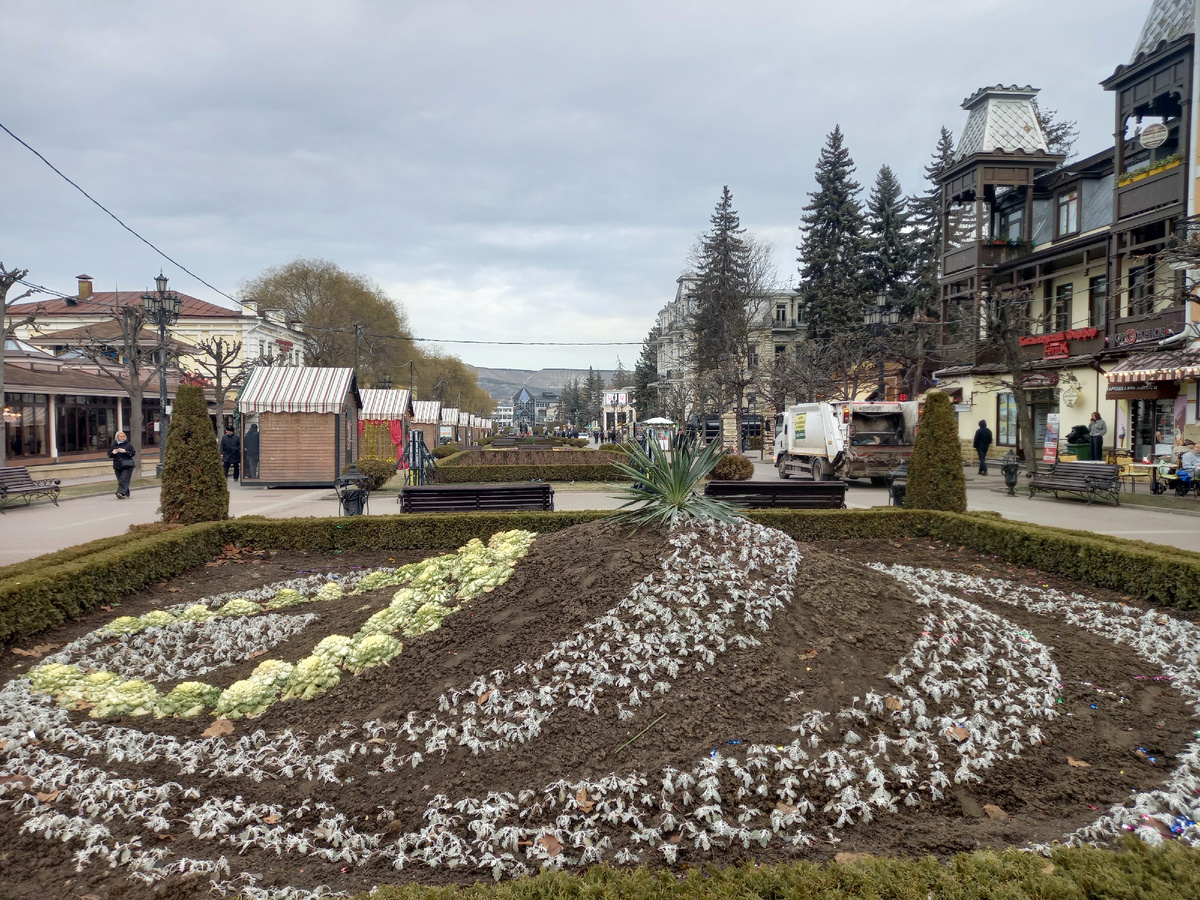 Продолжаем рассказывать о своих впечатлениях о Кисловодске, где оказались в разгар новогодних праздников, застав здесь ещё и Рождество. Стоит ли приезжать сюда зимой? Конечно, летний Кисловодск будет выглядеть куда как нарядные и привлекательней. Наверное, всё здесь цветёт и благоухает. А сейчас приходится смотреть только на подмерзшую декоративную капусту. Ну и кое-где торчат пучки жёстких листьев что-то типа агав. И никаких пальм. И всё же для жителя центральной России сухой тротуар уже привлекательней снежной каши или гололёда, что является типично зимней картиной для той же Москвы. Да, температура и здесь может колебаться, но незначительно. В первый наш день, 4 января, было 9 градусов тепла, солнечно. 5 января температура опустилась до минус 4-5, пошёл мелкий снег и пасмурно. Но к утру 6 января он в основном стаял, т.к. потеплело и вышло солнце. Дальше прогнозируют уже только потепление. Так что даже небольшие колебания температуры не мешают прогулкам. Центр Кисловодска удивил с