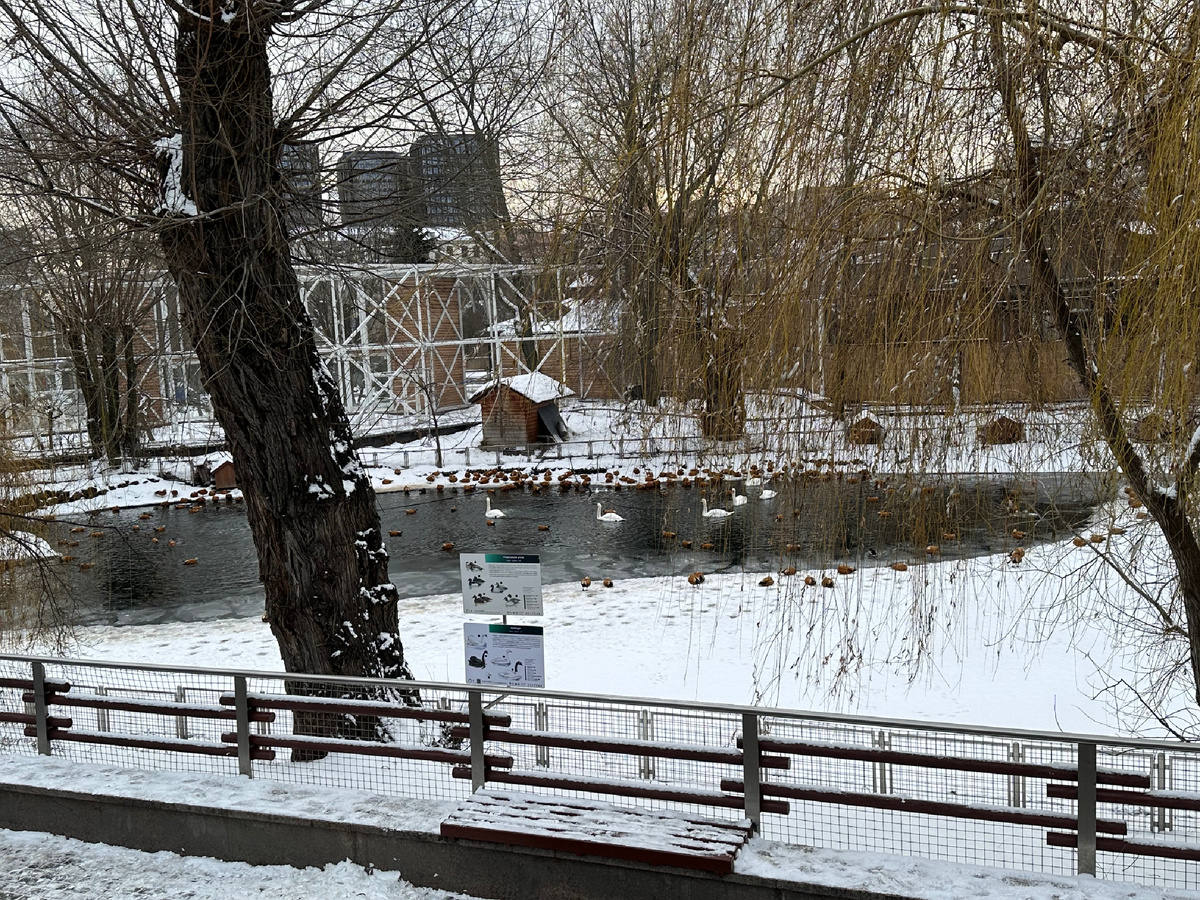 Чем заняться в зимний период, если гулять в парках уже наскучило, да и на коньках кататься тоже надоело? В таком случае стоит посетить Московский зоопарк, в котором обитает множество животных и птиц родом из Сибири, Дальнего Востока и Заполярья - они чувствуют себя в своей стихии, когда наступают холода и выпадает снег. Остальные животные зимуют в тёплых вольерах и встречают посетителей в любую погоду. Старая территория Проходя через главный вход, мы попадаем на Старую территорию зоопарка. В зимний период Большой пруд частично покрывается льдом, однако некоторые птицы остаются на пруду даже в морозы. Лебеди и утки, первыми встречают посетителей зоопарка. Фламинго проводят зиму в теплом вольере перед прудом. Кроме того, весь зимний сезон без отопления обходятся совы, черный гриф, белоголовый и белоплечий орланы, орлан-белохвост, степной орел, беркут. Если поднимается порывистый ветер, они прячутся в скалах или деревянных домиках. Также в холодное время года в уличных вольерах можно