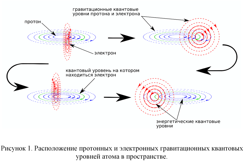 Протоны сосредоточены в атомном ядре, подвижность их ограничена. Электроны же находятся в постоянном движении вокруг атомного ядра и их гравитационные квантовые уровни постоянно изменяют свою конфигурацию. На рисунке 1 показано, как при движении вокруг протона в условном атоме направление движения квантовых уровней электрона постоянно изменяется в пространстве. В то же время квантовые уровни протона в обычных условиях не меняют своего положения.