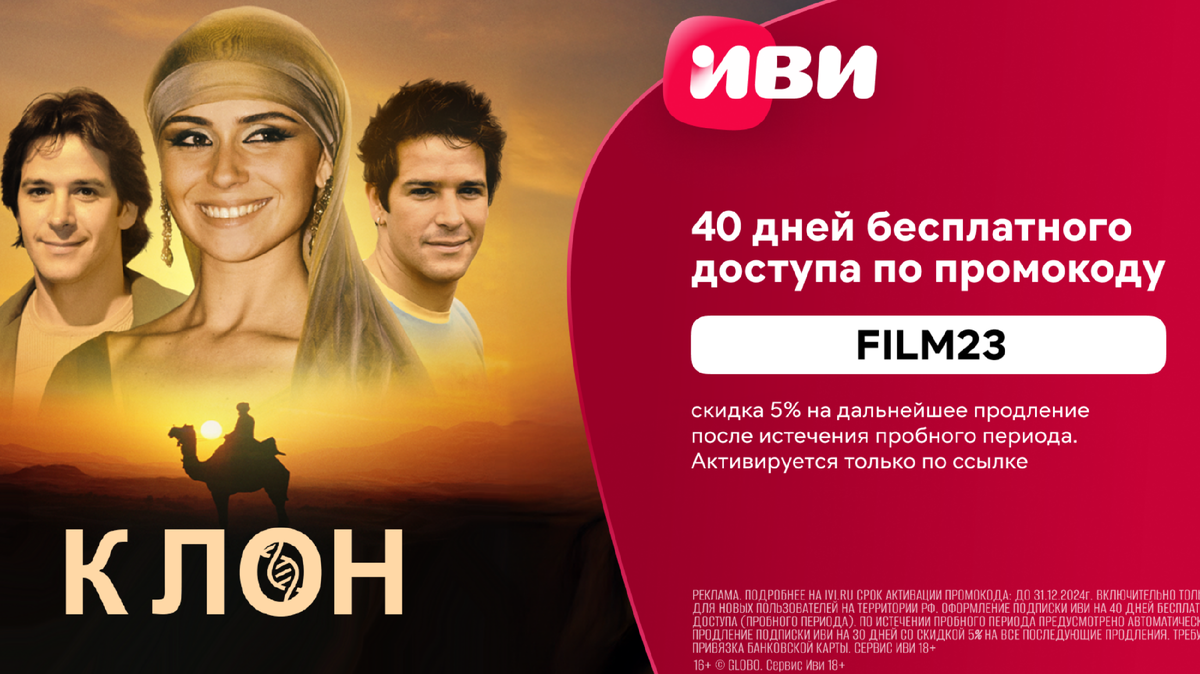 Тот самый «Клон» на Иви! Погрузитесь в увлекательную историю о любви и страсти, которая заставит переживать каждую минуту. Культовый бразильский сериал «Клон» доступен на Иви! 💔 С глубоким смыслом и интригует не хуже современной турецкой драмы! Присоединяйтесь к просмотру с подпиской Иви: FILM23 40 дней бесплатно + скидка 5% на все последующие продления. Переходите по ссылке, чтобы оформить подписку: https://ivi1.prfl.me/6238cc608d70de4bf05c082d/pvv93v?erid=2VtzqvCvVSJ