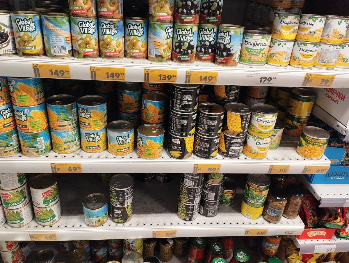 Уже не в первый раз покупаю кукурузу "Global Village", т.к. со скидкой она стоит всего 69 рублей, а это чуть ли не самая низкая цена на всех полках, хотя сама кукуруза прекрасная, не отличается от более дорогой. Удивило, что у "Бондюэль" цена всего 79 рублей, хотя, конечно, и упаковка заметно меньше, чем у других производителей. А за 139-149 рублей мы можем приобрести маслины с косточкой или без и оливки с креветками/лимоном, такая консервация и на каждый день, и на праздники годится.