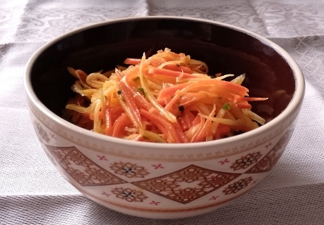 Я недавно открыла для себя репку, как-то не случалось раньше её попробовать, а тут попалась на глаза и купила. Интересный продукт и потенциал у него большой, ведь готовить можно самыми разными способами. А я начала с самого быстрого - приготовления салата из сырых овощей. Пропорции исключительно примерные, поскольку совершенно непринципиальные. 1 крупная морковь (200г.) 2 небольших или средних репки (300-400г.) 2 веточки петрушки 2ст.л. растительного масла (у меня горчичное нерафинированное) 2ст.л. 3-6% натурального уксуса 1ч.л. сахара 1/2ч.л. соли (по вкусу) 1/4ч.л. свежемолотого чёрного перца. Очищенные овощи натереть на тёрке (я использовала тёрку для моркови по-корейски), петрушку мелко порезать. Заправить салат солью, сахаром, уксусом и маслом, перемешать и дать настояться пару часов в холодильнике. Очень вкусно. И витаминно.
