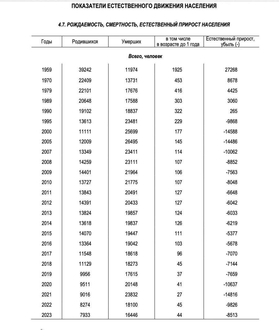 Брянская область стала вымирать с 1995 года. Это следует из анализа демографических данных, имеющихся в опубликованном статистическом сборнике «Брянская область 2024». С документом ознакомились «Брянские новости». Естественная убыль в регионе начала фиксироваться через несколько лет после развала СССР. Если в 1990 году количество родившихся (19 102 человека) превышало количество умерших (18 837 человек) на 265 человек, то уже в 1995 году естественна убыль составила 9868 человек. Далее рождаемость только снижалась, смертность остается высокой, все это приводит к значительной естественной убыли населения. Чтобы понять, как быстро уменьшается численность населения региона, можно сравнить данные за 65 лет. Скриншот страницы статистического сборника «Брянская область 2024» Если в 1959 году в Брянской области родилось 39 242 ребёнка, то в 2023 году этот показатель составил всего 7 933 — снижение в пять раз. Смертность за тот же период выросла: с 11 974 человек в 1959 году до 16 446 человек в