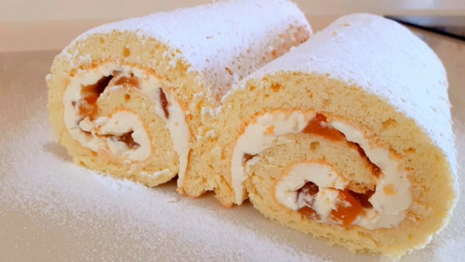Хочу поделиться рецептом: бисквитного рулета с домашним сливочным кремом и кусочками груш из варенья.