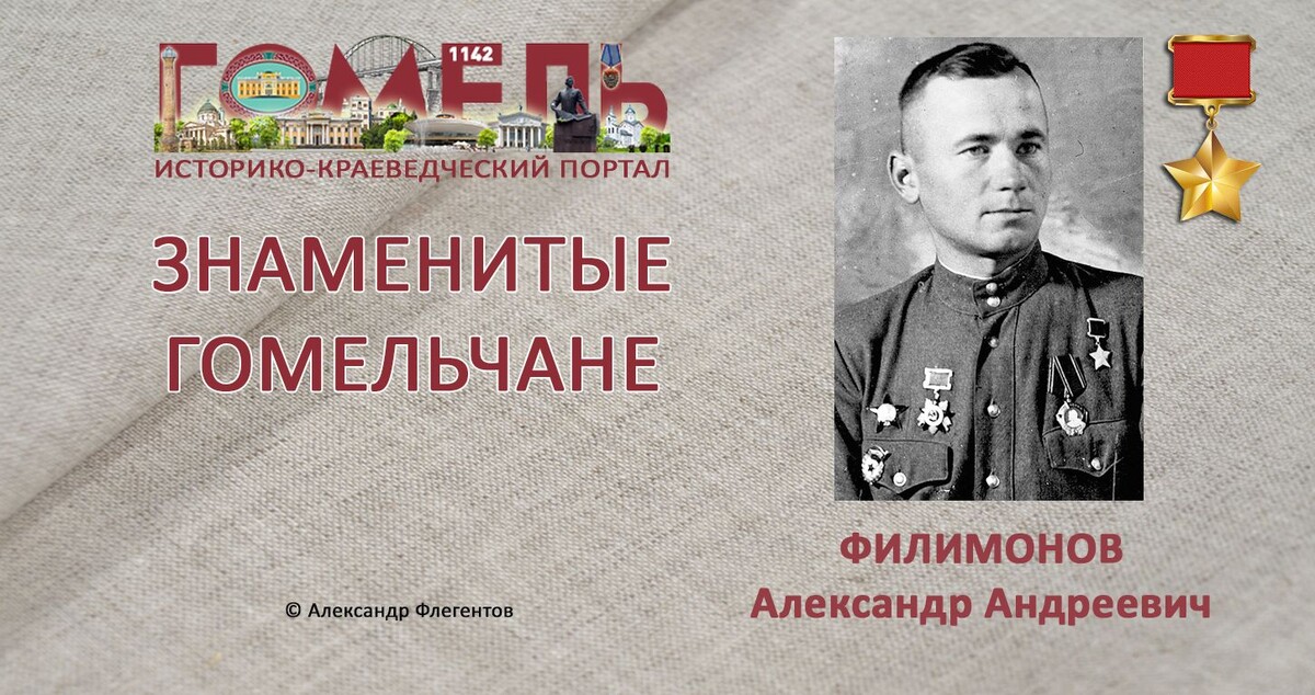 Александр Андреевич Филимонов (09.05.1918, д. Кучин Рогачёвского уезда Могилёвской губернии, ныне Кормянского района Гомельской области — 31.12.2007, Минск) — советский офицер-танкист, участник Великой Отечественной войны. Учёный-историк в послевоенное время, доктор исторических наук (1969), профессор (1970). Герой Советского Союза (27.06.1945). Старший лейтенант. Окончил десять классов школы. Работал с 1934 года счетоводом в колхозе «Искра», пионервожатым в школе, заведующим избой-читальней, секретарем сельсовета. В 1939 году окончил два курса Коммунистического института журналистики при ЦК КП(б) БССР, после чего проживал в городе Лунинец Брестской области, заведовал отделом в местной газете «Авангард». В начале Великой Отечественной войны А. А. Филимонов был отправлен в эвакуацию и 17 июля 1941 года призван на службу в Рабоче-крестьянскую Красную Армию. В 1942 году он окончил Орловское бронетанковое училище имени М. В. Фрунзе. С июля 1943 года — на фронтах Великой Отечес