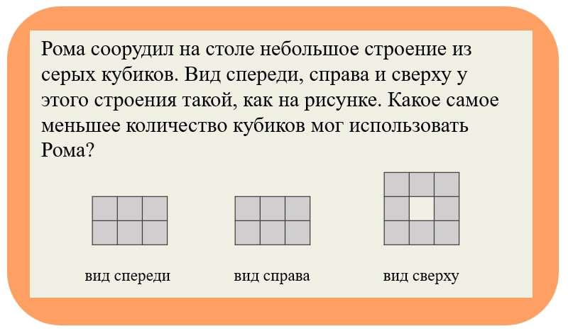 Друзья, представляю вам олимпиадную задачу для начальной школы. Что нам важно? Мы смотрим на вид спереди и вид справа и понимаем, что строение Ромы имеет два слоя. Смотрим на вид сверху — насчитываем 8 кубиков. Из нижнего слоя убирать кубики нельзя, иначе конструкция развалится, поэтому в нижнем слое должно быть 8 кубиков. Осталось представить, сколько может быть кубиков во втором слое, чтобы получились те виды спереди и справа, которые указаны в условии. На рисунке привожу пример такого расположения кубиков (один из нескольких возможных). Всего три кубика сверху могут дать указанные виды спереди и справа (при необходимости рекомендую сделать зарисовку). Наименьшее количество кубиков, которые мог использовать Рома, — 11. P.S. Дети часто не понимают условие — нужно представить такую конструкцию, чтобы в ней число кубиков было наименьшим из всех возможных вариантов. Именно это условие вызывает наибольшее затруднение у ребят. Друзья, в телеграм у меня есть рабочие листы на данную тему, чт
