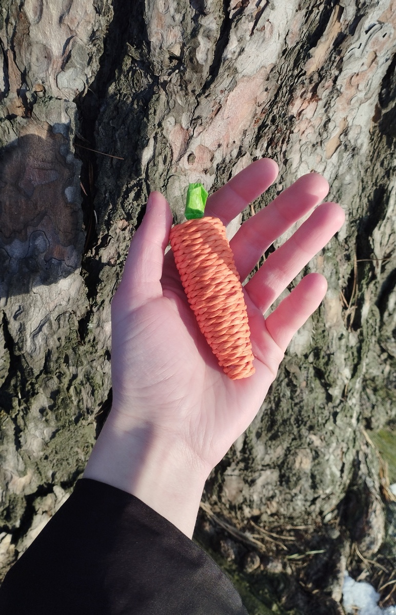 Выбор пал на эту симпатичную морковку. Игрушка представляла собой жёсткое основание, обмотанное съедобной рисовой бумагой, сплетенной косичкой, со звенелкой внутри. Кстати, размер ее порадовал, 13 сантиметров, остальные игрушки кота гораздо меньше. Все, думаю, надо брать, коту должно понравиться.