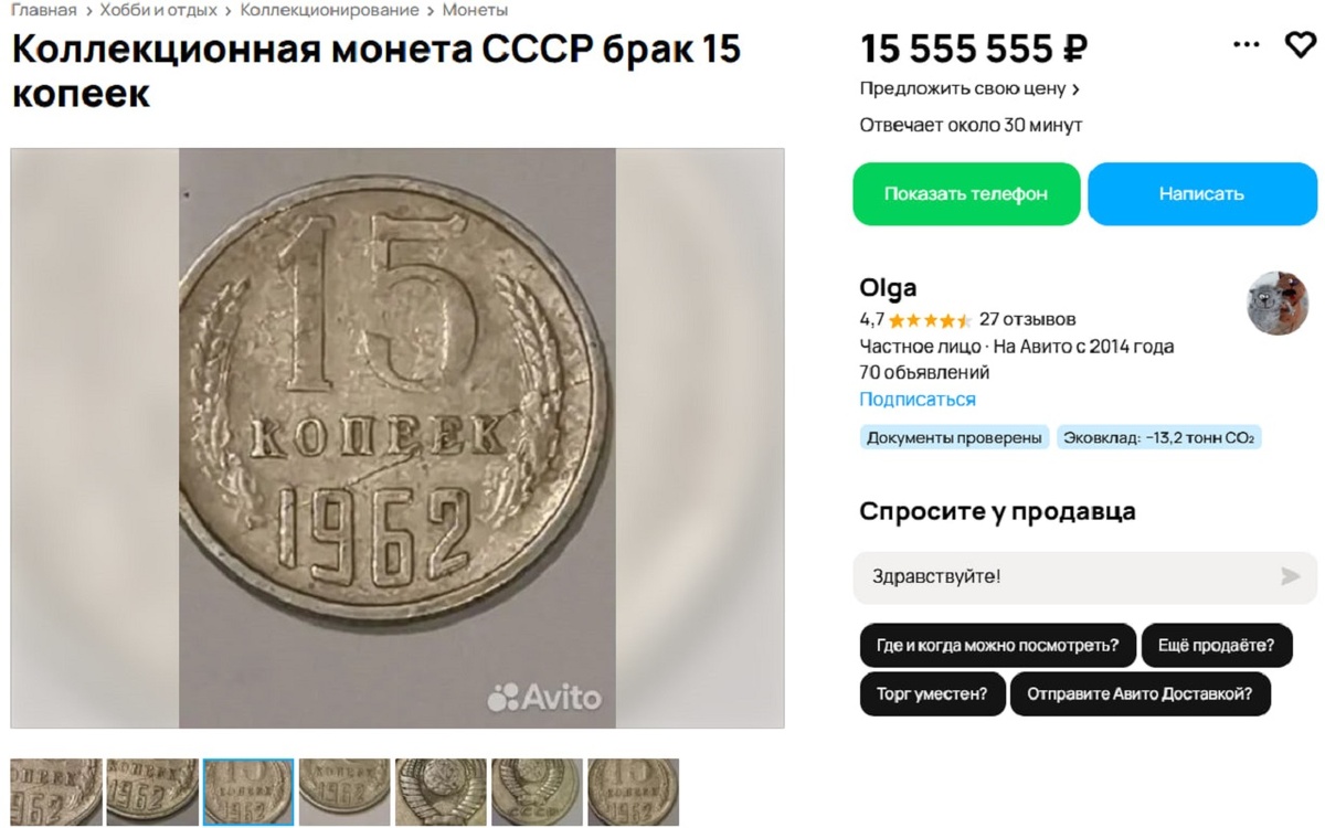Жительница Воронежа продает коллекционную монету СССР номиналом в 15 копеек за 15,5 млн рублей. При этом она рассматривает обмен. Объявление появилось на сайте бесплатных объявлений Avito. Согласно описанию монеты, ее выпустили в 1962 году, а повтор маловероятен. Также автор объявления заранее предупреждает – монета -бракованная. На фото видно раскол. — He меняюсь, не консультирую. Продаю. Свои монеты не предлагайте. Шуток не понимаю, отправляю в ЧС, — заявила продавец. При этом добавила, что обмен возможен, но только на авто, грузовую технику или недвижимость. Согласно размещенным ранее объявлениям Ольги, она также продает монету с браком 1997 года за 45 тысяч рублей и монету с браком, номиналом в 15 копеек, выпущенную в 1981 году за 34 тысячи рублей. Также в арсенале жительницы Воронежа имеются монета Содружества независимых государств за 20 тысяч рублей, копейка 1986 года за 5,5 тысяч рублей, и монета номиналом 2 копейки, выпущенная в 1990 году. За нее Ольга просит 90 тысяч рублей.