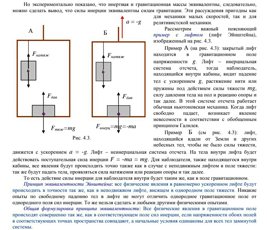 Лифт начинает равноускоренное движение( а если равномерное, то есть момент ускорения очень мал?). Что увидит наблюдатель? Ему ПОКАЖЕТСЯ, что объект начинает движение к полу лифта, с ускорение равным ускорению лифта. Об этоми точно так же пишет Эйнштейн и Купер("физика для всех" том 2). То есть они понимают, что "вверх" с ускорением движется лифт, а отнюдь не объект. Да и не может объект никуда двигаться, так как никакие силы на него в данный момент не действуют. Кроме разве слабого взаимодействия с корпусом лифта, обусловленном притяжением объекта и корпусом лифта. Но и в таком случае объект будет смещаться "вверх", что очевидно. Пока пол лифта не достигнет объекта, никаких инерционных свойств у объекта наблюдаться не будет. Вот когда лифт начнёт воздействовать на объект, проявятся свойства инерции, связанные с массой. О каком поле инерции говорит Эйнштейн? О какой эквивалентности ускорения и гравитационного поля? Если лифт находится на Земле или над Землей, то объект взаимодействуя с Землей( наблюдатель выпускает объект из руки) начинает РЕАЛЬНО двигаться к Земле. Что наблюдатель и фиксирует как процесс падения на пол лифта. А в лифте в отсутствии гравитации? Объект неподвижен, смещается "вверх" лифт, просто наблюдателю кажется , что объект движется в сторону пола лифта, да ещё и с ускорением. Получается, что Эйнштейн( и Купер) считают иллюзию движения и реальное движение эквивалентными? Отсюда делается вывод о наличии поля инерции, воздействующего на объект, под действием которого объект смещается к полу лифта? Забавно. Иллюзия движения порождает поле инерции соответствующее гравитационному? Рассмотрим " детский" пример: