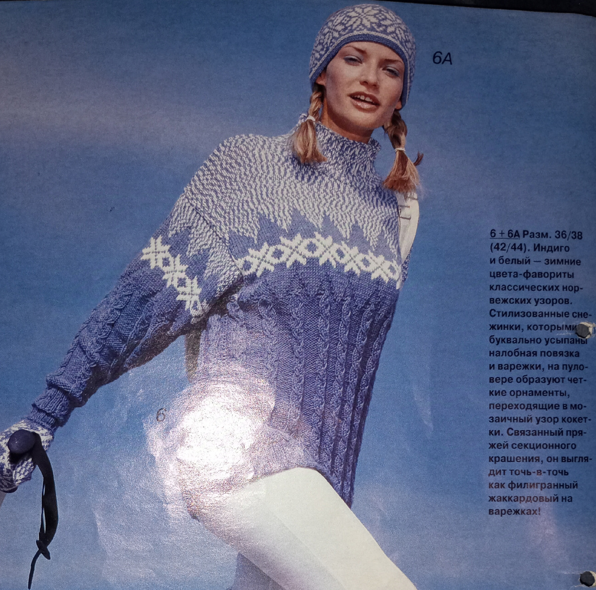 Сочетание белого и цвета морской волны идеально подходят для зимних узоров. В моем исполнении свитер связан из бобиной пряжи в шесть сложений. Участок меланжевого цвета связан из той же пряжи в сложении - три белых нити и три нити цвета морской волны. Модель взята из журнала ВЕРЕНА 12/98. Для тех, кто хочет повторить прикладываю описание и схемы. Всем удачного исполнения и ровных петелек))))