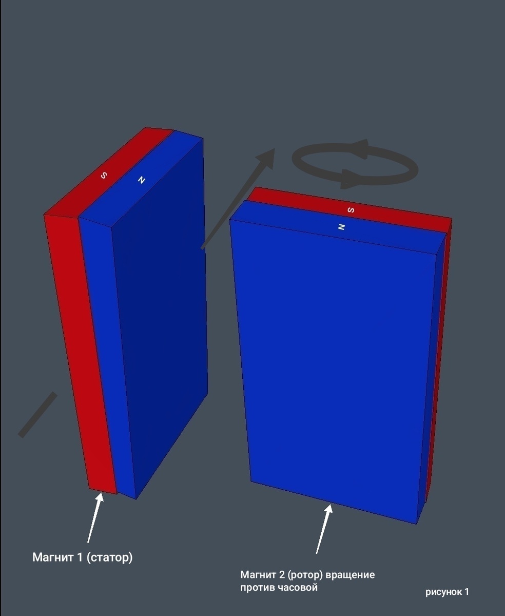 Это ранее неизвестное физическое явление взаимодействия магнитов. Например , если два магнита находясь на расстоянии друг от друга и на них не действует другие силы а действуют только их собственные магнитные , то они обязательно начнут поворачиваться и притягиваться друг к другу что б соединиться и образовать завершённую систему, хочу подчеркнуть поворачиваться будет магнит 2 а двигаться по направлению стрелки магнит 1 ,на начальном этапе (именно на начальном этапе чтобы показать магнитное движение и оно управляемо ) чтобы выстроиться и начать объединяться , это новое магнитное явление я назвал " магнитное движение " и сближаться друг к другу до объединения рисунок 1. Описание управляемого магнитного движения. Если дать степень свободы движения магнита-ротора только параллельно плоскости магнита-статора то он будет двигаться параллельно силовым линиям магнита-статора вперёд той полярностью которая одноимённа с взаимодействующей полярностью магнита-статора рисунок 2,3, соответствен