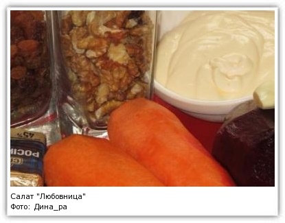 По какой причине салат "Любовница" получил такое интригующее название, неизвестно. Либо он посвящён женщине "с изюминкой", либо яркое, вкусовое сочетание послужило поводом для ассоциаций. Это простой в приготовлении, яркий и очень вкусный салат. Для приготовления салата понадобятся: • Свекла — 150 г • Морковь — 100 г • Сыр — 100 г • Изюм — 3 ст.л • Майнез — 3 ст.л • Грецкий орех — 2 ст.л • Чеснок — 2 зубчика Время приготовления — 15 мин. Сырую морковь очистить и натереть на крупной тёрке. То же самое проделать с варёной свеклой и плавленым сыром. Изюм замочить в холодной воде на 20 минут. Орехи слегка раздробить. Укладываем слоями: 1-й слой: тёртая морковь с майонезом 2-й слой: изюм с майонезом 3-й слой: тёртый плавленый сырок 4-й слой: давленый чеснок с майонезом 5-й слой: тёртая варёная свекла с майонезом 6-й слой:дроблёные орехи 7-й слой: майонез. Салат готов. Приятного аппетита!