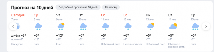 В Новосибирск возвращаются зимние погодные условия. С 7 по 15 января в городе ожидаются снегопады и понижение температуры, сообщает «Яндекс.Погода». В течение недели дневные температуры будут колебаться от -6 до -8 градусов, а ночью в некоторые дни показатели могут опускаться до -14 градусов. Погода в Новосибирске будет пасмурной и снежной. В среду, 8 января, ожидается снег с температурой в -6 °C днём и -12 °C ночью. В течение недели снегопады продолжатся с небольшими колебаниями температуры в пределах -5...-12 °C. К концу недели, 11 и 12 января, температура останется на уровне -5...-6 °C, а также будут возможны небольшие снегопады и облачность с прояснениями.