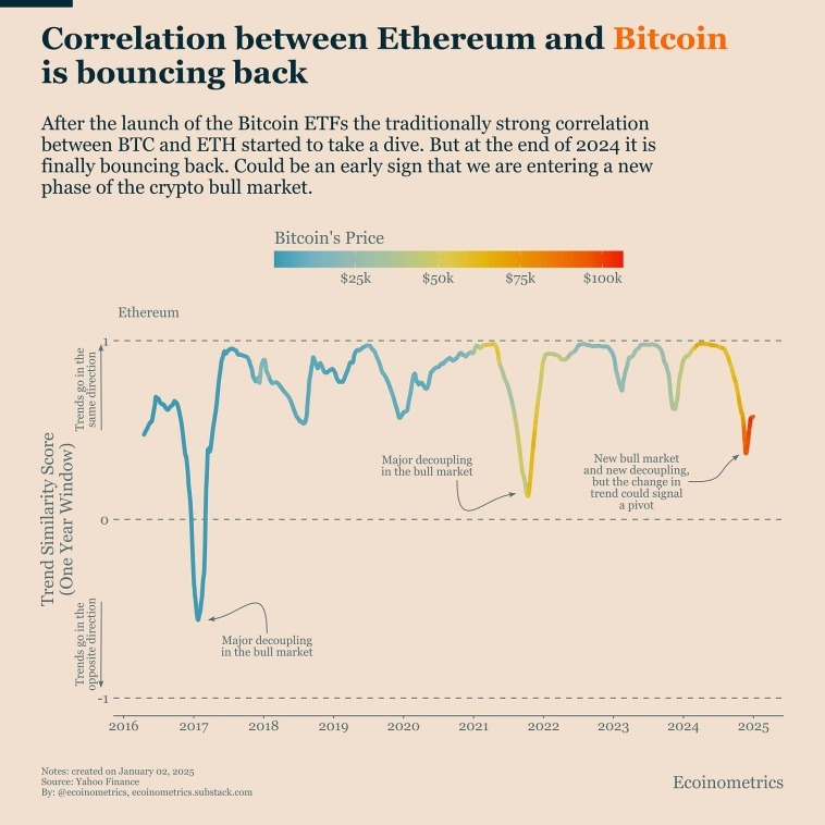 Перед тем как вы погрузитесь в изучение статьи, обратите внимание на тот факт что всё упомянутое в ней не является финансовой рекомендацией для принятие более взвешенного решения просьба провести свое собственное исследование. ________________________________________________________________________ Запуск биткоин-ETF в 2024 году повлиял на динамику рынка. Можно сказать это был единственный фактор роста освоения Биктоина в мире. Сейчас корреляция эфира (ETH) с биткоином снизилась, но в декабре начала вновь расти. Это типичный признак "сезона альткоинов", по мнению Ecoinometrics, когда другие криптовалюты начинают активный рост вслед за биткоином. Однако на этот раз у альткоинов пока нет нарратива для роста, помимо AI хайпа, в отличие от биткоина, который привлекает внимание институциональных инвесторов через ETF. Почти все ключевые показатели и макроэкономические условия поддерживают бычий сценарий для биткоина в 2025 году, такой вывод делают аналитики издания на основе пары ончейн инди