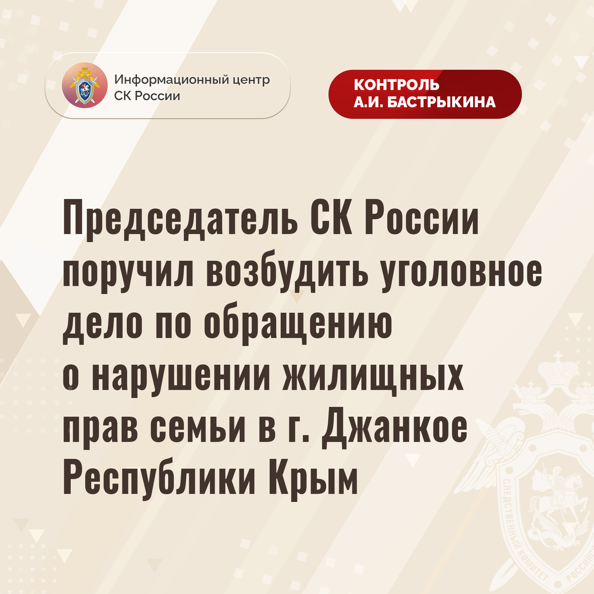 Председатель СК России поручил возбудить уголовное дело по обращению о нарушении жилищных прав семьи в г. Джанкое Республики Крым В Информационный центр СК России обратилась жительница Республики Крым. Она сообщила, что проживает с семьей в составе шести человек, в том числе двумя несовершеннолетними внуками в малогабаритной комнате общежития по улице Советской в городе Джанкое. При этом здание, 1974 года постройки, находится в непригодном состоянии: водо- и теплоснабжение отсутствуют, косметический ремонт не проводился более 17 лет, из-за антисанитарных условий появились насекомые и грызуны. С 2008 года семья состоит на учете лиц, нуждающихся в улучшении жилищных условий, однако до настоящего времени благоустроенное жилье им не предоставлено. Неоднократные обращения в различные инстанции результатов не принесли. В ГСУ СК России по Республике Крым и городу Севастополю по данному факту проводилась процессуальная проверка. Председатель Следственного комитета Российской Федерации Александ