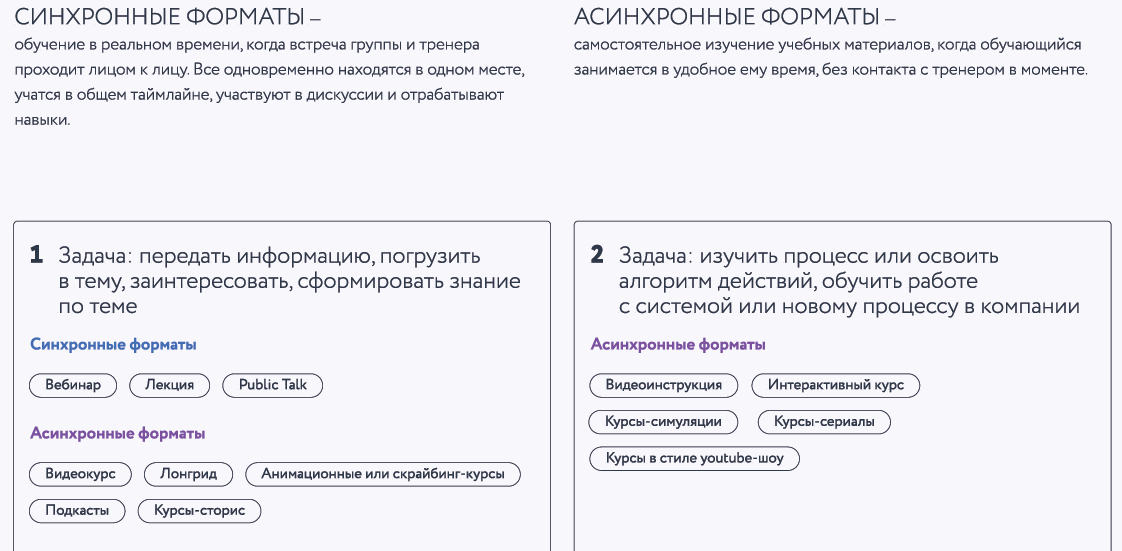 Как организовать наполнение сайта в зависимости от образовательных форматов. Я начинаю с того: есть живой человек, который рассказывает материал. Или его нет. Если есть: то в одну "сторону" сайта можно разместить каталог бизнес-игр, мастер-классов, вебинаров, лекций или паблик ток (проще объяснить это через образ - это когда неприлично богатый человек, например, как Илон Маск ходит туда и сюда по сцене и рассказывает что-то про Марс). Если нет: то в другую сторону сайта можно положить каталог видеоинструкций, подкастов, курсов, чтений (или ещё их называют лонгриды или статьи). p.s. часто на сайтах такого деления нет. Хотя, думаю, люди могут выбирать подходящие развивающие мероприятия именно так: если ли кто-то, кому можно задать вопросы или нет. Как - то была следующая ситуация. Компания, с которой заключили договор на проведение инструктажа по Excel для 8 человек из одного отдела, пригласила преподавателя. Этот преподаватель принудительно выключил звук у всех, кроме себя. Аргументиру