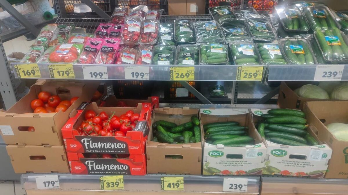 "Цены на помидоры и огурцы заоблачными стали. В "Пятерочке" томаты есть свыше 400 рублей за килограмм, а один огурец - аж 109 рублей. В "Магните" чуть ниже. В магазинах заявляют, что с начала года эти овощи в цене взлетели на 20-30 процентов. Короче в магазин зайти и с ума сойти можно",