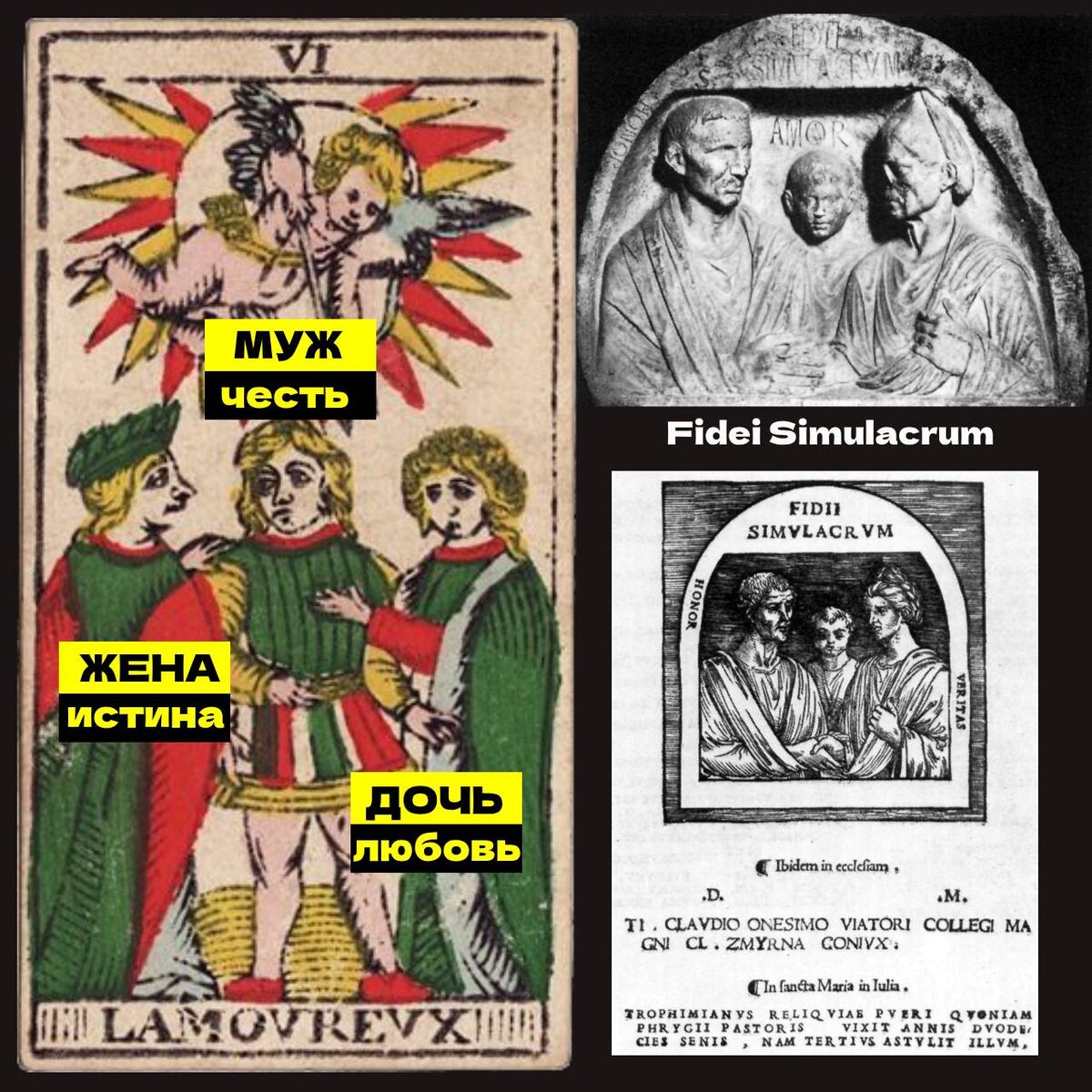 На канале есть цикл видео, где каждое видео посвящено, отдельно - одному старшему аркану. Думал, получится закончить цикл за год, но з_а_т_я_н_у_л_о_с_ь_...)) Чтобы, не забыть, по старшему аркану "Влюблённые", которые наверное лучше, на русском языке, называть - "Возлюбленные"? (возлюбленный - "дорогой сердцу", толковый словарь). Итак, - На карте "Марсельского Таро" мы видим четыре персонажа, тут особенно все "карты путает" некий купидон со своим знаменитым луком и стрелой...Понятно, что речь идёт о классическом "любовном треугольнике", две дамы не поделили джентльмена, и каждая тянет в свою сторону, типичная история, но это на первый взгляд... В XV веке (как раз, интересующая нас эпоха), на территории Италии (а где, ещё?) нашли надмогильную стелу, где были изображены муж, жена и их ребёнок (на карте "Марсельского Таро", стала - дочерью). Очень эта стела и сюжет понравились "титанам эпохи Возрождения", тем более, таких античных изображений находили не одно, и на могильных памятниках,